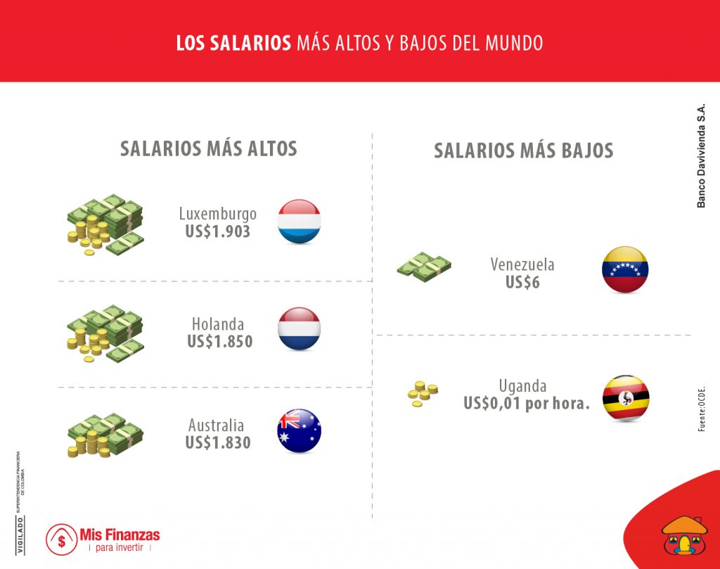 Por ley, todos los años el salario mínimo legal aumenta en Colombia y en varios países del mundo. En el país, el alza para el año 2019 fue de 6%, quedando el sueldo mínimo en $828.116 pesos, es decir US$253 con la TRM del 18 de enero de 2019 que fue de $3.140. ¿Cómo está Colombia respecto a los salarios mínimos de la región y el mundo? Aquí le contamos.