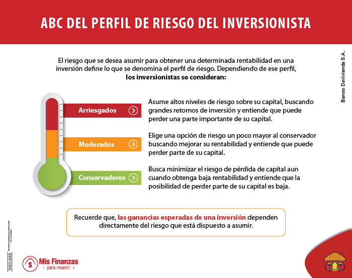 Ahora, debe analizar dos factores: Primero, ¿cuáles son las ganancias que espera obtener con la inversión? Por ejemplo, si por cada $100.000 que invierta mensualmente desea recibir $100 cada mes. Y, segundo, ¿cuál es el nivel de riesgo que está dispuesto a asumir para obtener esa ganancia? Esto le ayudará a definir su perfil de riesgo. Probablemente, usted haya escuchado la frase: “a mayor riesgo, más alta es la rentabilidad”, esto sucede, pues las inversiones con riesgos altos ofrecen mayores ganancias que aquellas en las que la posibilidad de tener pérdidas es menor. En la mayoría de los casos, el perfil de riesgo se divide en 3 categorías: